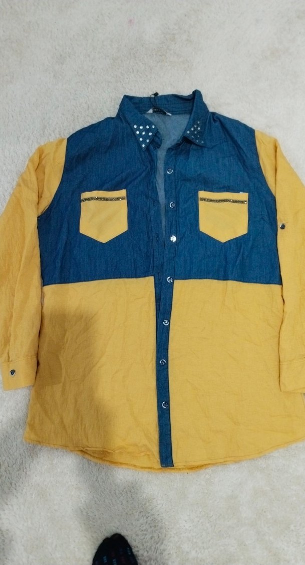 Uzun kollu, yakalı ve düğmeli kadın gömleği. Sarı ve mavi denim kumaştan, cepler ve yaka üzerinde parlak detaylar bulunur. Salaş kesim ve midi boyda, günlük sokak stili için uygundur.