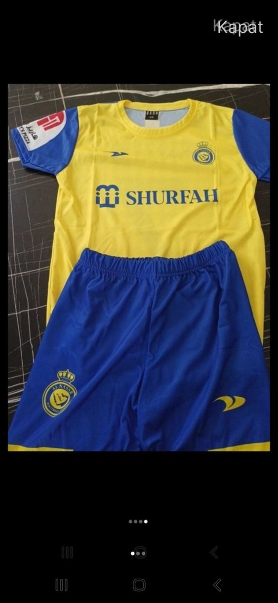 Parlak sarı ve mavi renklerde, kısa kollu, fitted kesim forması ve şortu. Yuvarlak yaka, baskılı desen ve fırfır detayları bulunur. SHURFAH markalı. ⚽