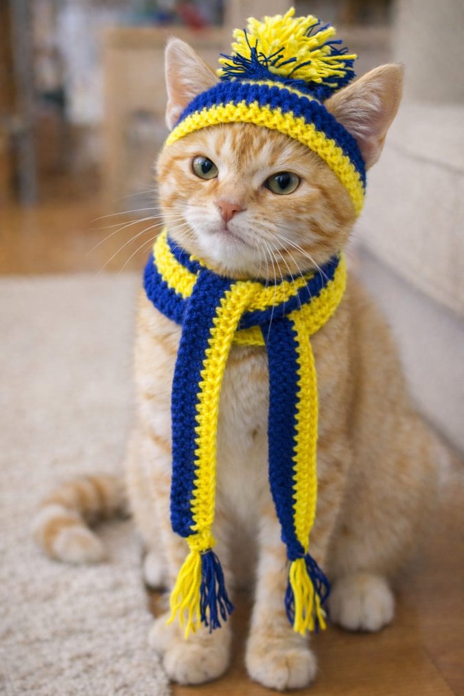 Kediler için sarı ve mavi renklerde örgü şapka ve atkı seti, püskül ve ponpon detaylıdır. #fenerbahçe #forma#fenerbahçeformasi #atkı