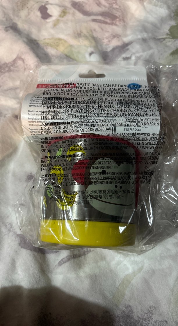 Canlı sarı taban ve gri detaylara sahip çocuk termos şişesi. İçecekleri sıcak tutar ve taşınması kolaydır. Şeffaf plastik torbada ambalajlıdır. Orjinal ve sıfırdır