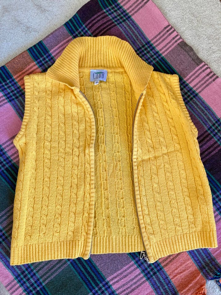 Sarı merserize örgü yelek, kollu olmayan ve yakalı tasarıma sahip, yumuşak örgü kumaştan yapılmıştır. Klasik kablo örgü deseni ve fermuarlı kapanışı vardır.