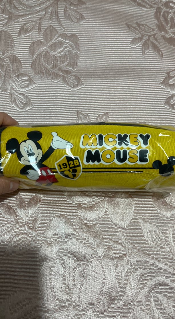 Renkli sarı kalemlik Mickey Mouse baskılı ve önünde fermuarlı cep bulunur.