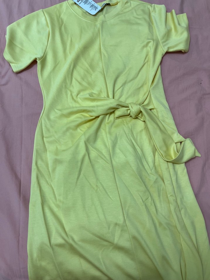 Sarı midi elbise, kısa kollu ve yuvarlak yakalıdır. Yumuşak sentetik kumaştan, drapeli ve vücuda oturan bir kesime sahiptir. Günlük sokak stili için uygundur. Yeni ve etiketli ürün pazarlık payı vardır