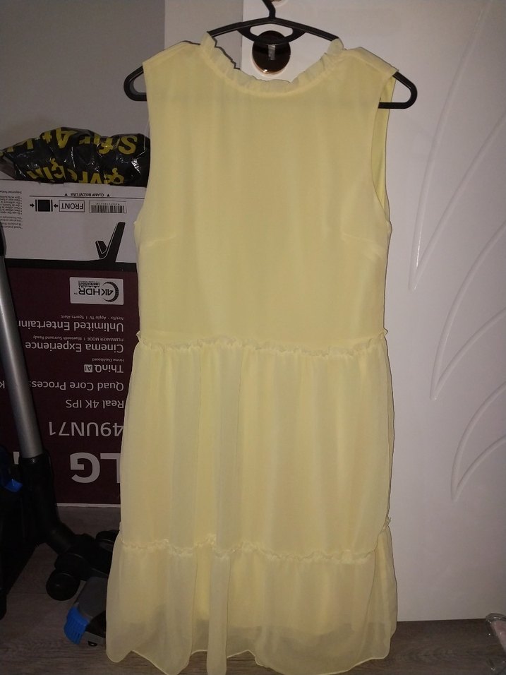 Pastel sarı renkte, satenimsi kumaştan, V yakalı ve kolsuz midi boy bohem elbise. Bol kesimi ve robalı detaylarıyla vintage tarzını yansıtır.