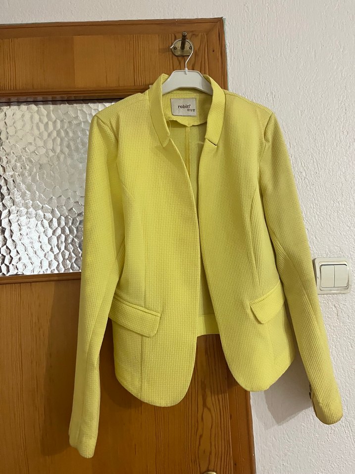 Sarı midi boy, düğmeli, kesik yakalı kadın blazer ceketi. Pürüzsüz sentetik kumaştan, normal kesim ve uzun kolludur, ofis için uygundur.