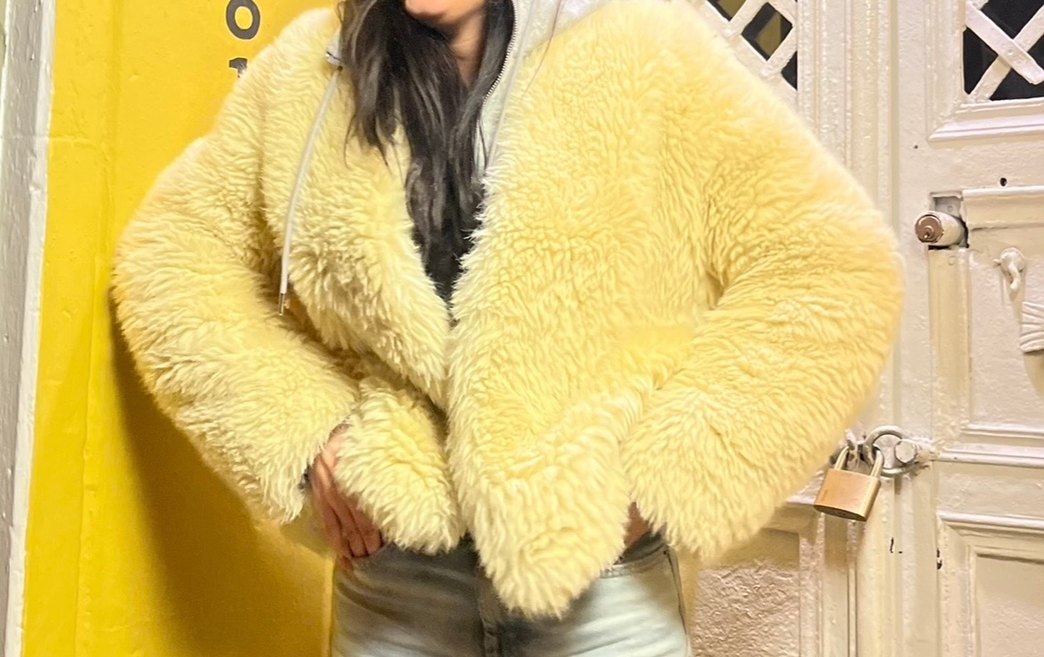 Sarı midi boy, bol kesim, uzun kollu, yakalı kadın peluş ceket. Yumuşak ve sıcak kumaştan, tüy detaylı, desensiz ve rahat sokak stili için uygun.