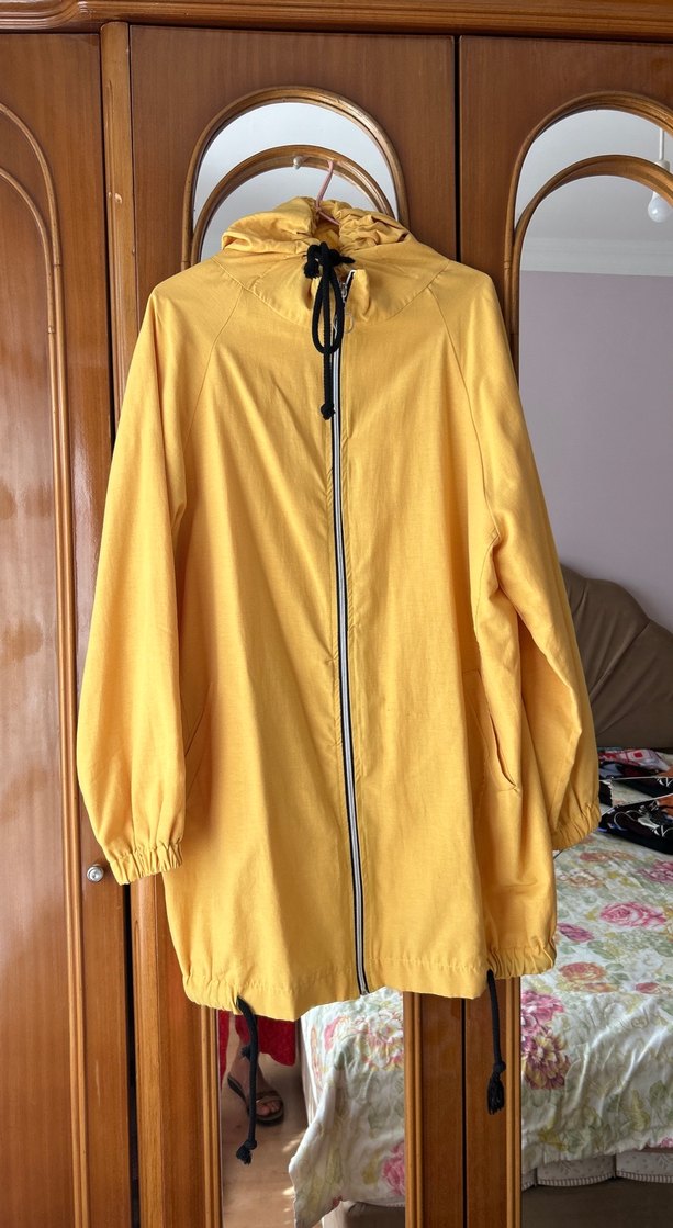 Sarı, parlak görünümlü, uzun kollu, yüksek yakalı ve fermuarlı rahat kesim midi boy yağmurluk. Günlük kullanıma uygun sentetik kumaştan yapılmıştır. ☔