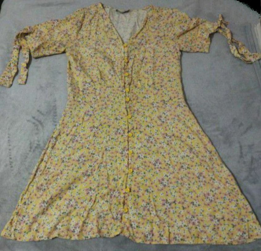 Sarı midi boy, V-yaka, kısa kollu, düğmeli ve bol kesim elbise. Hafif çiçek desenli, günlük kullanıma uygun.