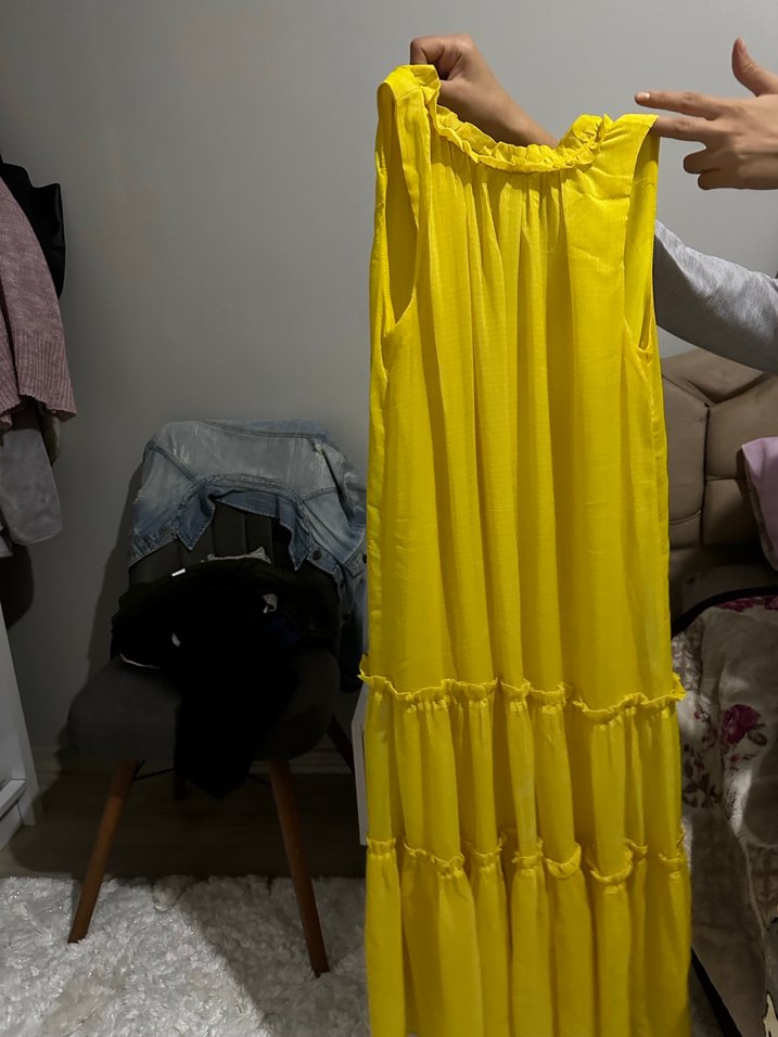 V yaka, kolsuz sarı midi elbise, volan detaylı ve yumuşak sentetik kumaştan. Rahat kesimi ve parlak görünümüyle günlük kullanıma uygun.