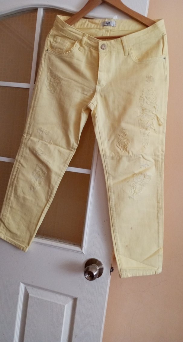 Midi boy kesim, sarı renkte, hafif yıpranmış detaylı boyfriend denim pantolon. Sokak stiline uygun, günlük kullanıma şık ve rahat bir seçenek. 28/29 bedene uyumludur
