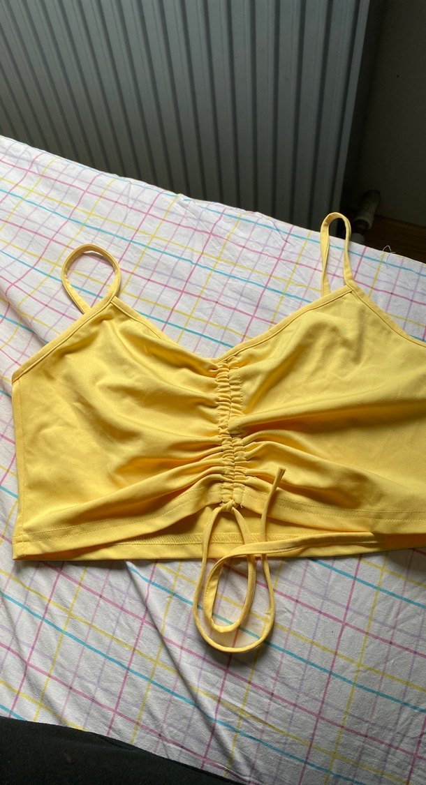 İnce askılı, ön kısmı büzgülü, açık sarı midi uzunluğunda crop esnektir.