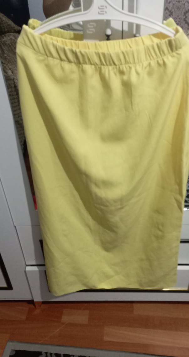 Sentetik kumaştan yapılmış, drapeli, fitted kesim, açık sarı midi uzunluğunda kadın eteği.