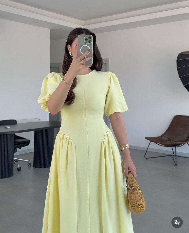 Sarı Midi Elbise, Kısa Kollu, Salaş Kesim