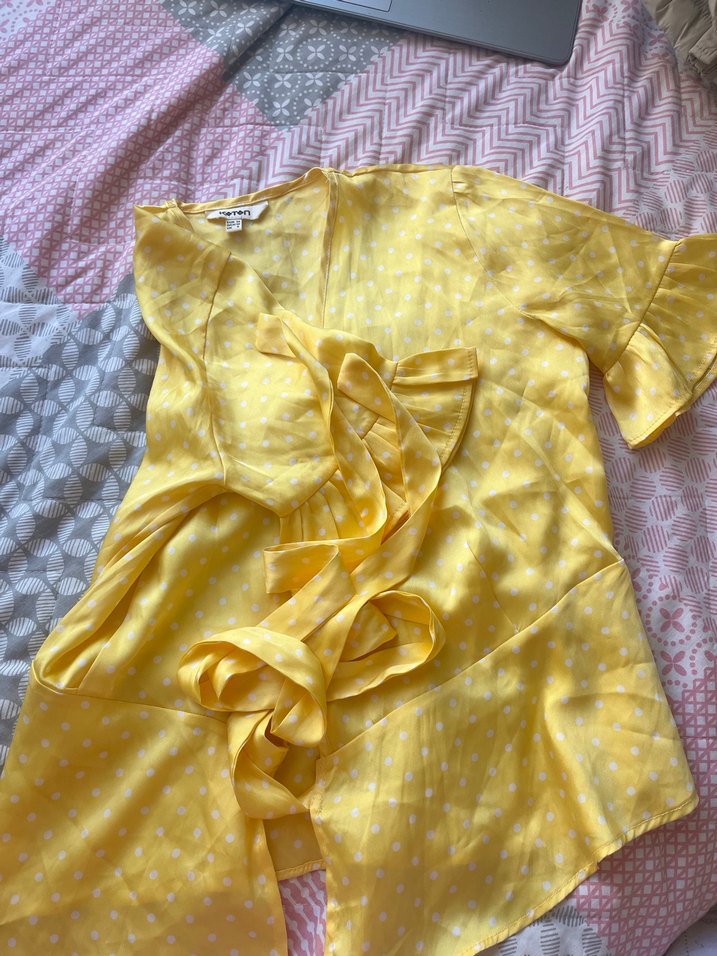 Sarı renkte, V yakalı, askılı kollu, bol kesim . Pastel tonlarda tie-dye desenli ve midi boydadır.
