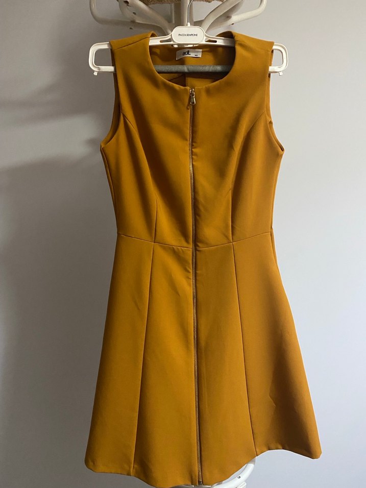 Fermuarlı, kolsuz ve askısız tasarıma sahip, sarı midi boy oturan elbise. Sentetik kumaştan, parlak ve minimal görünümlü, ofis için uygun. ✨