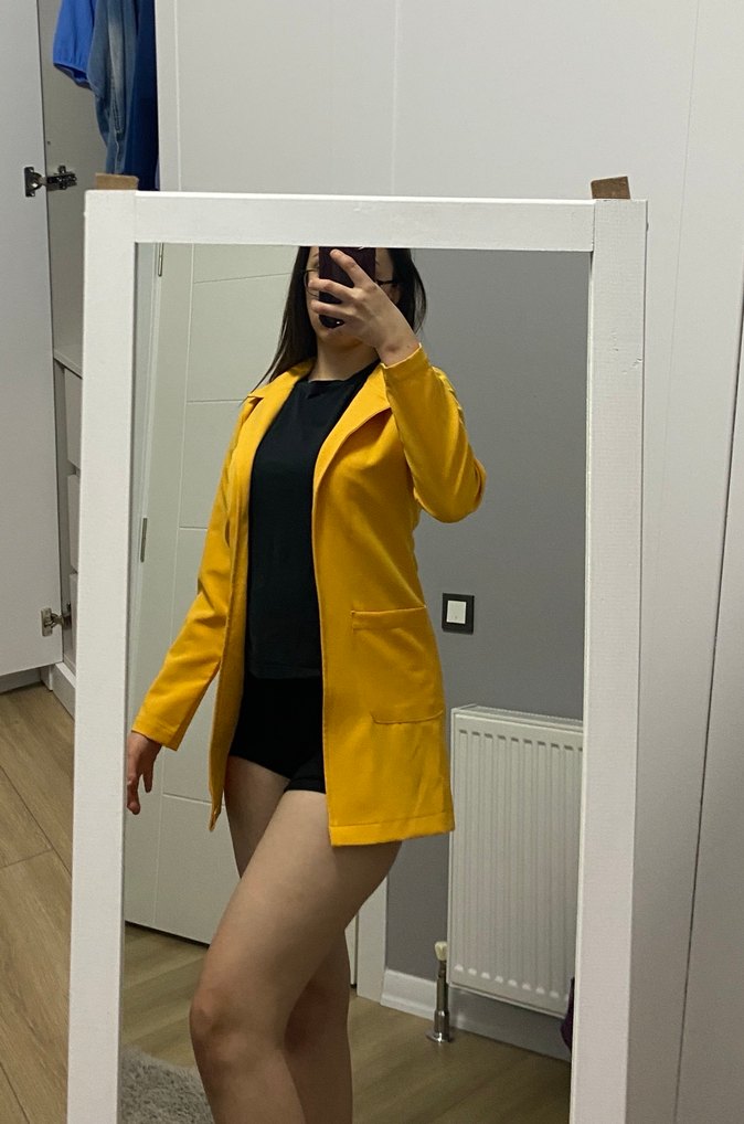 Parlak sarı renkte, notched lapel yakalı ve uzun kollu, vücuda oturan midi blazer. Sentetik kumaştan yapılmıştır, günlük kullanım için şık ve rahat. marka temsili