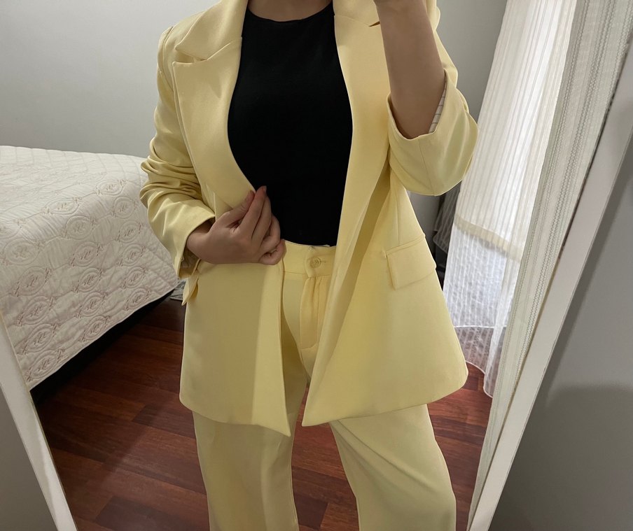 Sarı midi blazer, kesik yakalı, uzun kollu ve ipeksi dokulu. Düzenli kesim ve pastel tonuyla ofiste şık ve rahat bir stil sunar. ✨