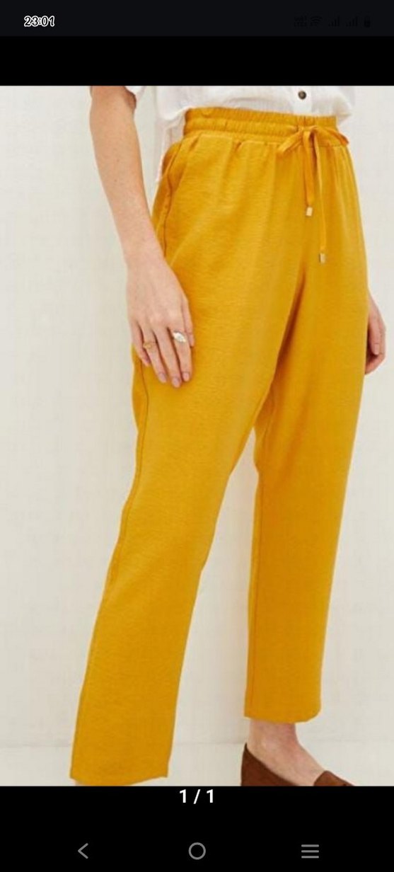 Parlak sarı renkte, bol kesim midi uzunluğunda, keten kumaştan kadın pantolon. Günlük rahat sokak stili için uygun. ✨