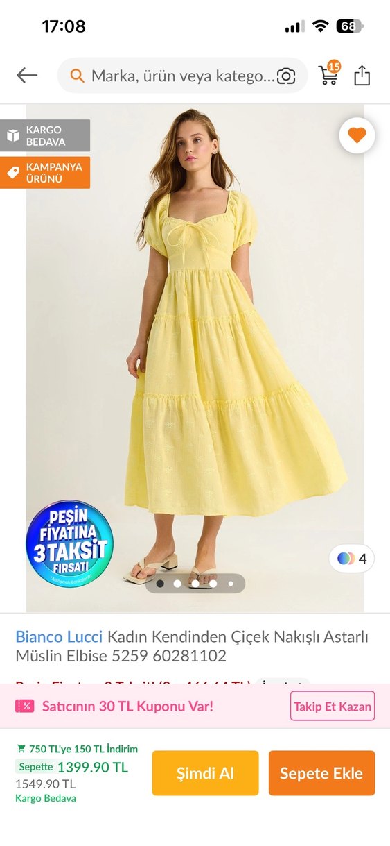 Hiç giyilmedi arkadaşlar göğüs kısmı biraz bana açık geldiği için satıyorum. Sarı midi boy, bol kesim, fırfırlı ve kayık yaka elbise. Yumuşak sentetik kumaştan, minimal bohem tarzda, askılı kolları ile romantik akşamlara uygun.
