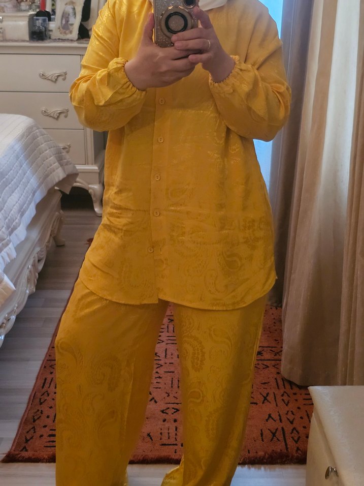 Parlak sarı renkte, ipeksi dokulu, bol kesim kadın takim. Uzun kollu, yüksek yakalı ve düğmeli, hafif batik desenli. Günlük kullanıma uygun. jakar kumas M beden hiç giyilmedi.
