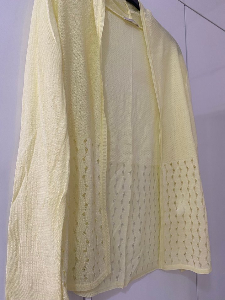 Sarı midi kadın hırka, dökümlü kesim, uzun kollu ve V yakalıdır. Yumuşak sentetik kumaştan üretilmiş, rahat bohem tarzda, günlük kullanım için uygundur.