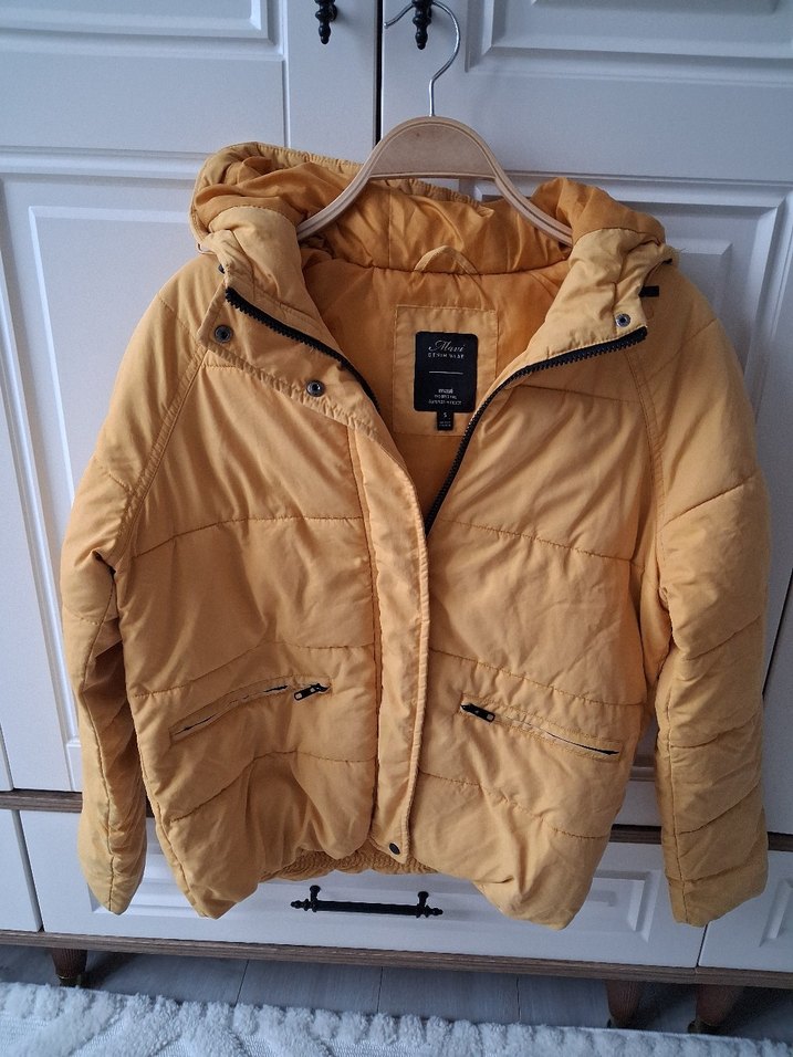 Sarı renkli, düğmeli, uzun kollu, rahat kesim kadın kışlık mont. Notlu yaka ve parlak yüzeye sahip, yumuşak ve sıcak kumaştan üretilmiştir. Rahat sokak stili için uygundur. ❄️