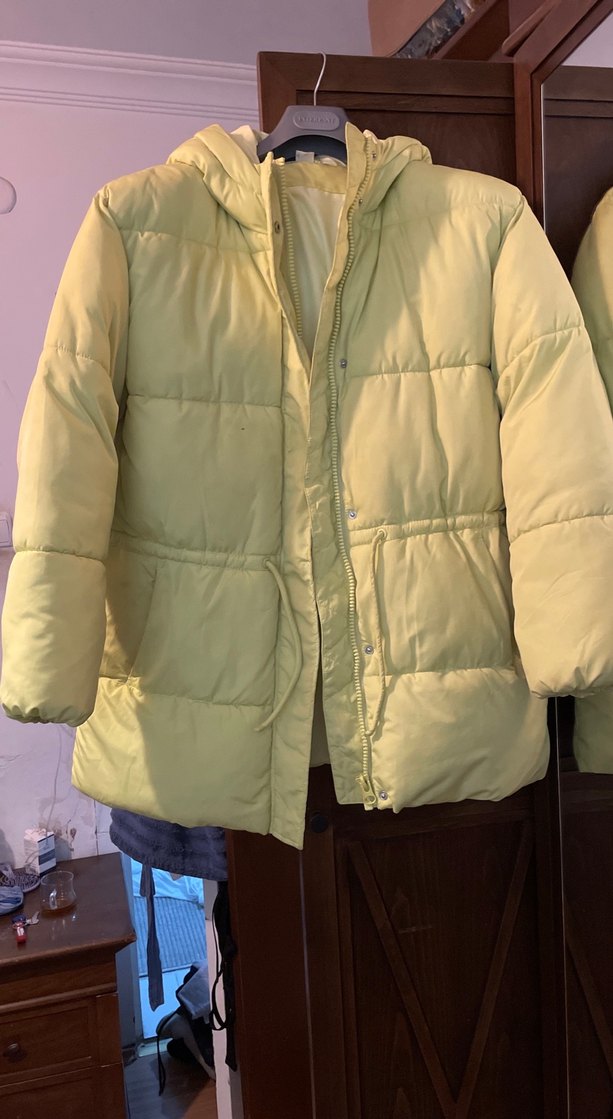 Sarı, düğmeli, yumuşak ve sıcak kumaştan midi uzunlukta, uzun kollu, notched lapel kesimli kadın kışlık mont. Sokak stili ve günlük kullanıma uygun.