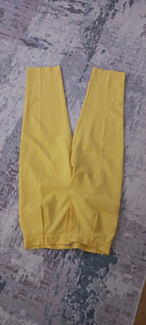 Sarı midi boy, regular fit kadın pantolon, yumuşak sentetik kumaştan. Düz tasarımıyla minimal ve zahmetsiz şıklık sunar, günlük kullanım için uygundur.