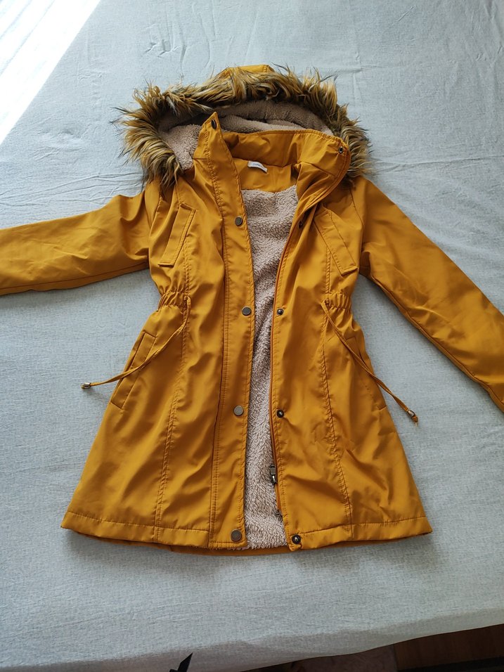 Sarı, midi uzunlukta, kürklü kapüşonlu ve uzun kollu bu fitted mont, yumuşak ve sıcak kumaştan üretilmiştir. Dış mekan kullanımı için uygundur. m beden yazıyor ama dar kesim, s bedene uygun