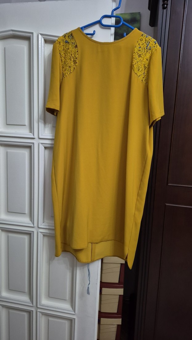 Sarı midi tunik, kısa kollu, yuvarlak yaka ve bol kesimdir. Omuzlarda dantel detayları ve dökümlü tasarımı vardır, yumuşak sentetik kumaştan üretilmiştir.