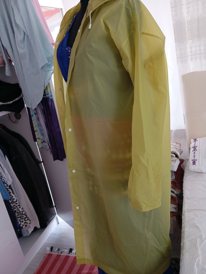 Sarı midi yağmurluk, bol kesim, uzun kollu ve yakalıdır. Düğmeli ön kısmı ve sentetik kumaşıyla günlük sokak stiline uygundur. ️