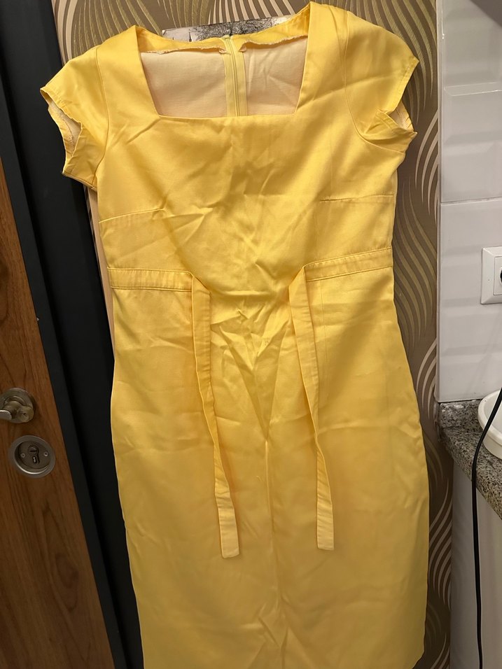 Sarı midi elbise, kemerli ve kapak kollu, kare yaka ve parlak dokusuyla ofis için uygun.