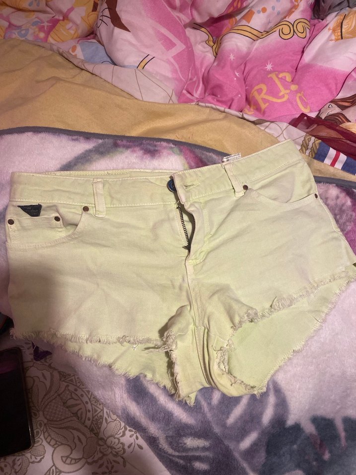 Sarı midi uzunlukta keten kadın şort, düğmeli ve bol kesimlidir. Desensiz, yıpranmış etek ucu detayına sahiptir ve trend günlük, sokak stili ile uyumludur.