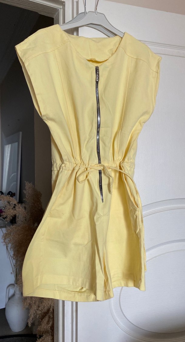 Sarı midi uzunlukta, fermuarlı ve halter yakalı kısa tulum. Yumuşak sentetik kumaştan, sokak modasına uygun kesimiyle dikkat çekiyor.