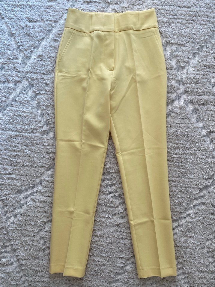 Zaraza marka 36 beden dar kesim pantolon Sadece 1 kere törende giydim. Çok iyi durumda minik bir lekesi var o da yıkanınca çıkar. Sarı midi boy, regular fit kadın pantolon. Minimalist, desensiz ve sentetik kumaştan yapılmıştır. Ofis için şık ve rahat bir tercihtir. ✨