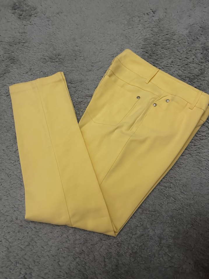 Sarı midi boy, regular kesim kadın pantolon. Yumuşak sentetik kumaştan, sade ve pastel renkli, rahat ve şık bir görünüm sunar.