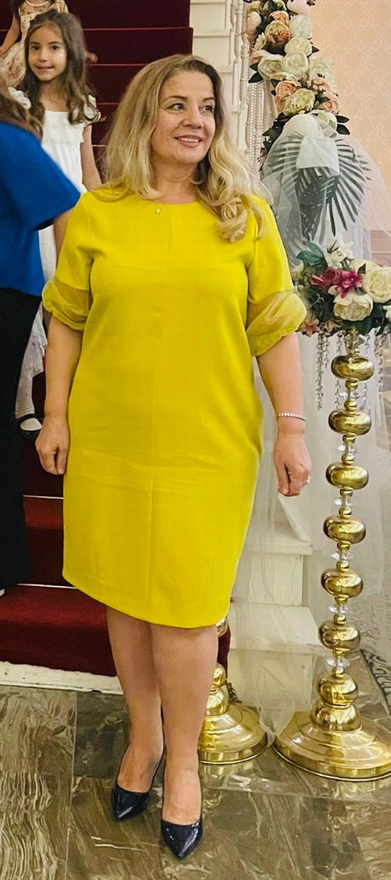 Sarı midi elbise, yuvarlak yaka ve kabarık kısa kollu, sentetik kumaştan, normal kesim. Ofis kullanımı için uygundur.