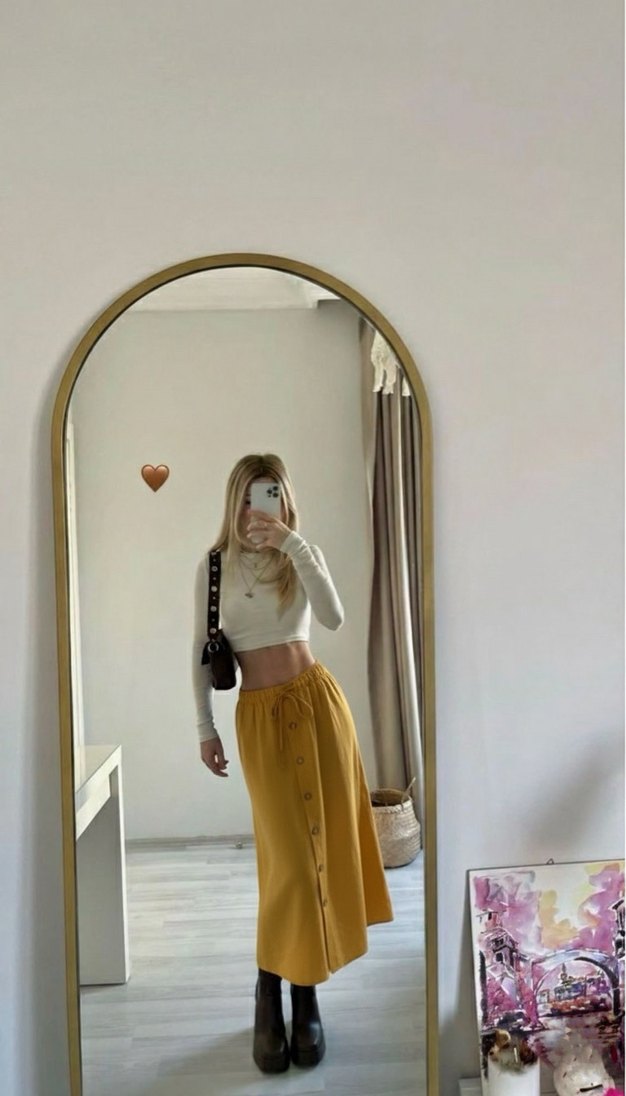 Pamuklu, sarı midi etek, bol kesim ve düğme detaylarıyla günlük rahatlık sunar.