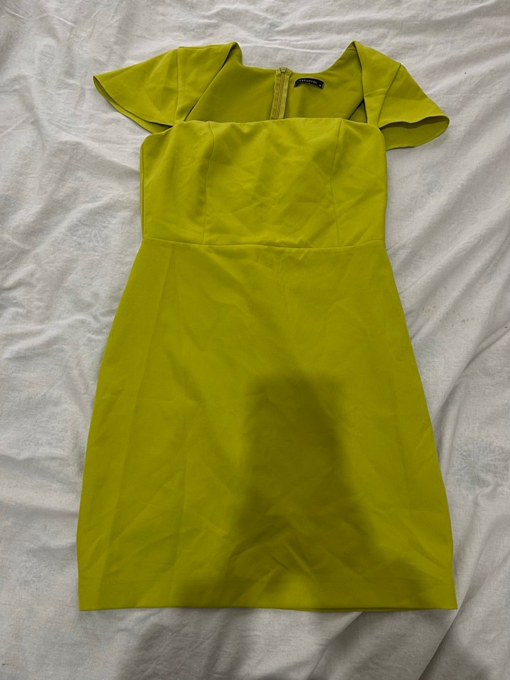 Parlak sarı renkte, drapeli ve straplez kesime sahip, sentetik kumaştan yapılmış, vücuda oturan midi kadın elbisesi. Minimalist ve modaya uygun sokak stili için ideal.