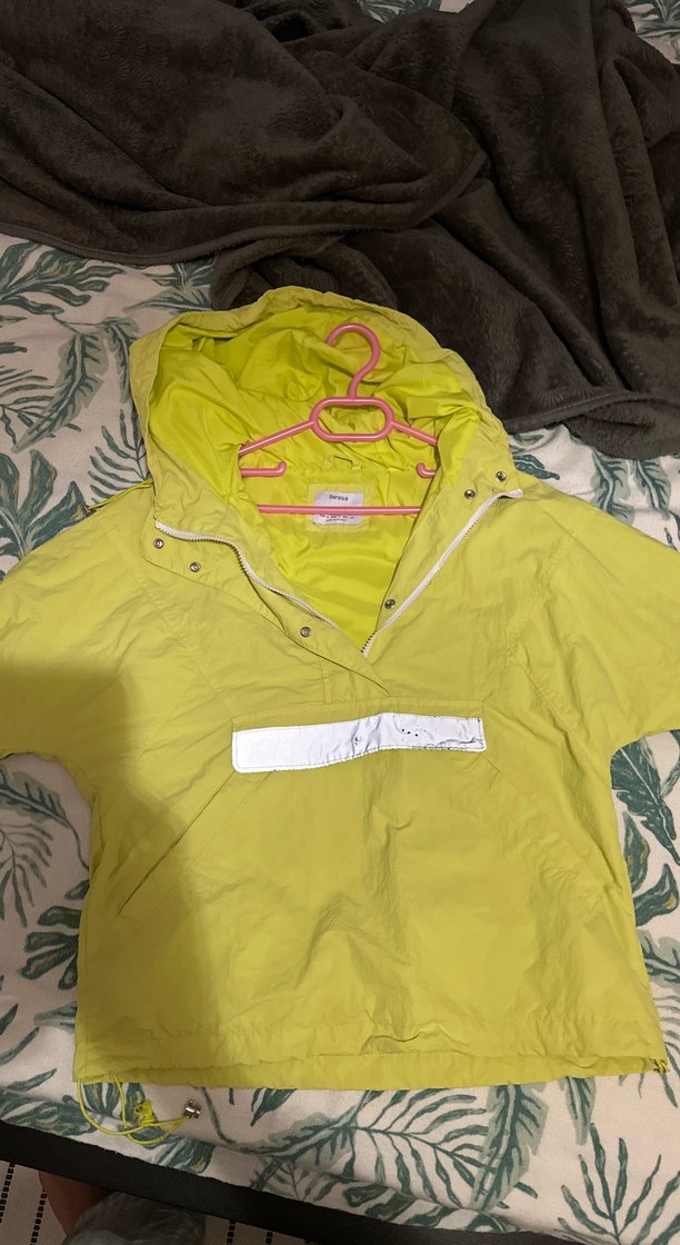 Pastel sarı renkli, sentetik kumaştan, kapüşonlu, uzun kollu, yüksek yakalı, fermuarlı, rahat kesim midi boy kadın ceket.