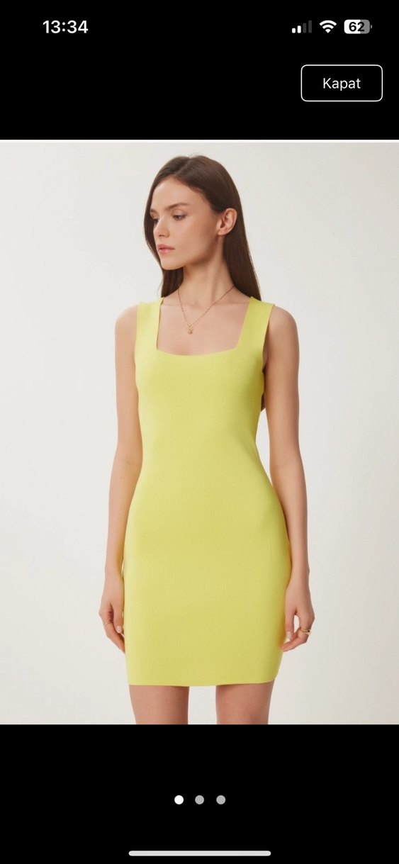 Sarı midi triko elbise, kolsuz ve kare yaka tasarımıyla dikkat çeker. Yumuşak sentetik kumaştan yapılmış, minimal ve çağdaş bir stile sahiptir. Romantik akşamlar için uygundur.