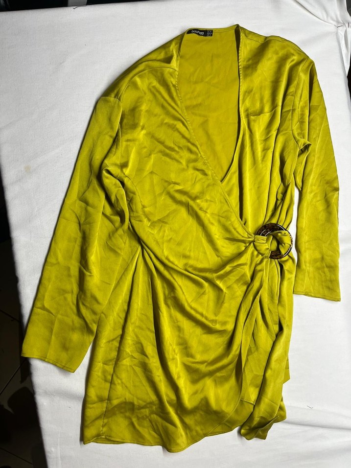 Sarı, parlak kumaştan midi uzunlukta, bol kesim ve uzun kollu kadın elbisesi. Yanında yuvarlak tokalı sarma detayına sahiptir.