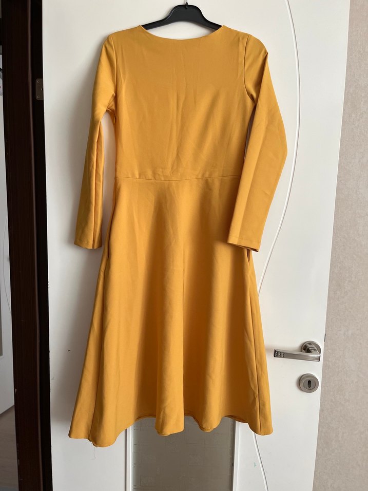 Sarı midi elbise, uzun kollu ve drapeli tasarıma sahip. Salaş kesimi ve yuvarlak yakasıyla, parlak sentetik kumaştan günlük kullanıma uygun.