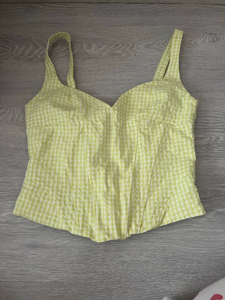 Yumuşak sentetik kumaştan yapılmış, V yaka ve düğme detaylı sarı, vücuda oturan bustiyer. Kolsuz ve midi uzunlukta, rahat sokak stili için uygun.