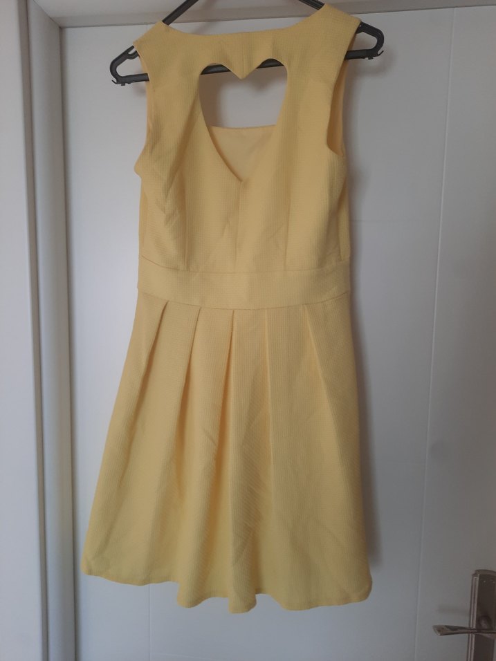 Yumuşak sentetik kumaştan yapılmış, V yakalı, kolsuz ve pilili detaylara sahip sarı midi elbise. Sırtında kalp şeklinde kesim bulunur, romantik akşamlar için uygundur.