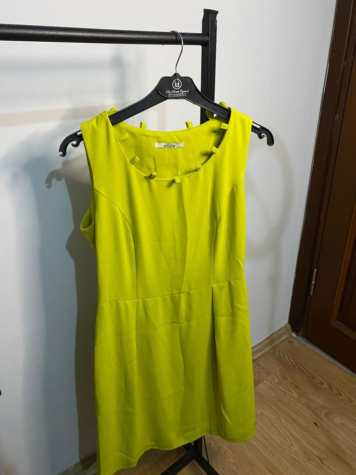 Sarı, kolsuz midi elbise, V yakalı ve pliseli detaylara sahip. Sentetik kumaştan, fitted kesim ve minimal stil, günlük kullanım için uygun.