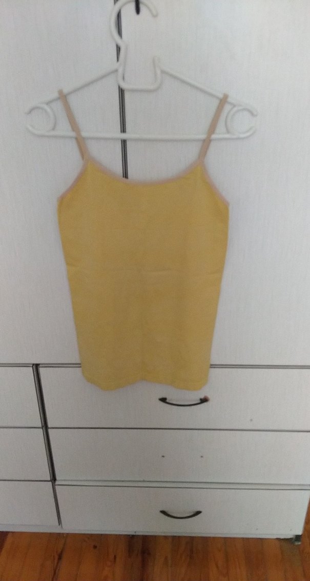 Bu dar kesim kadın askılı atlet, açık sarı renkte ince askılara ve kısa boyuta sahiptir, günlük sokak stili için yumuşak sentetik kumaştan üretilmiştir.