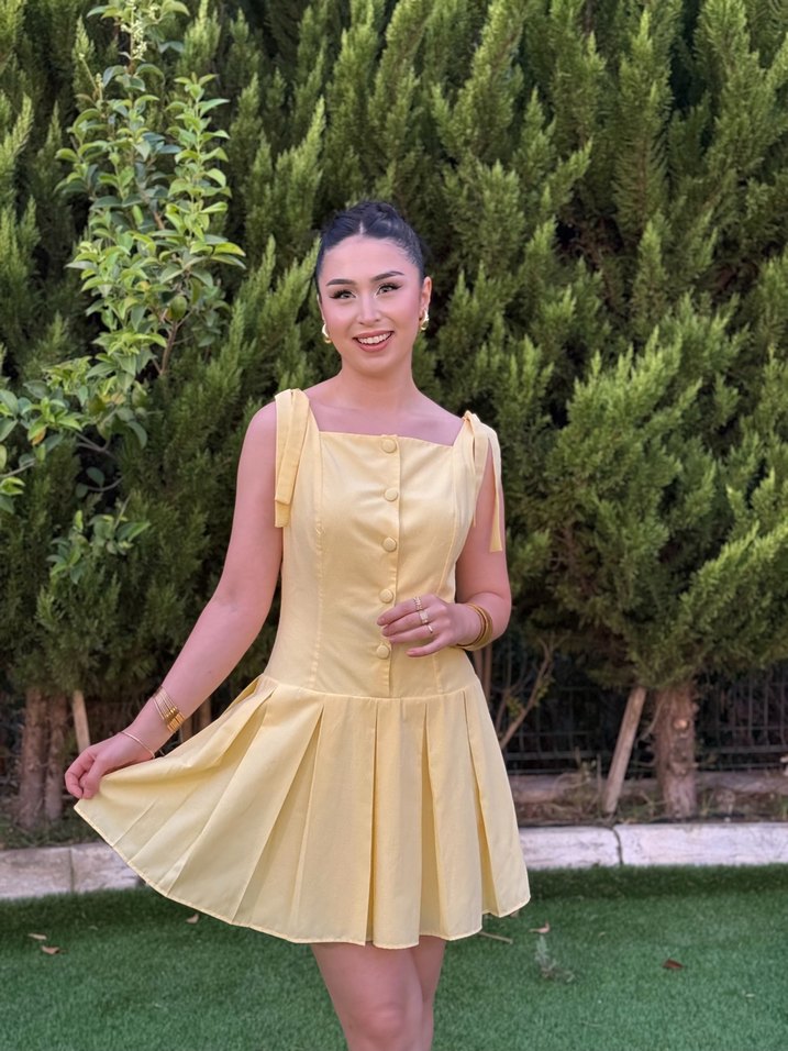 Sarı Mini Askılı Pilili Kadın Elbise - Görsel 2