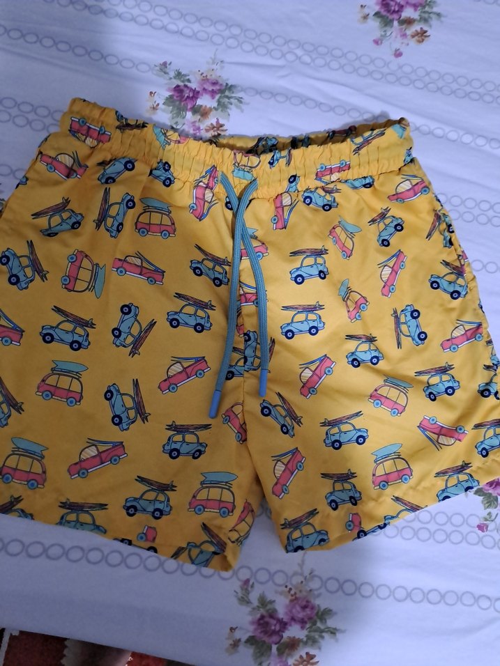 Rahat kesim, canlı sarı renkte, renkli baskılı vintage arabalarla erkek deniz şortu. Düğmeli detay ve bağcıklı lastikli bel bulunur. ️