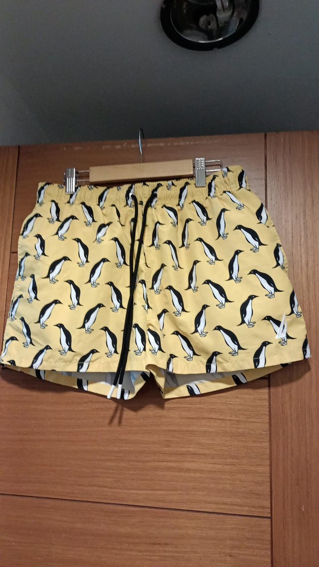 Renkli penguen baskılı, belinde tokası olan sarı mini erkek mayo şortu, plaj ve sokak stiline uygun.